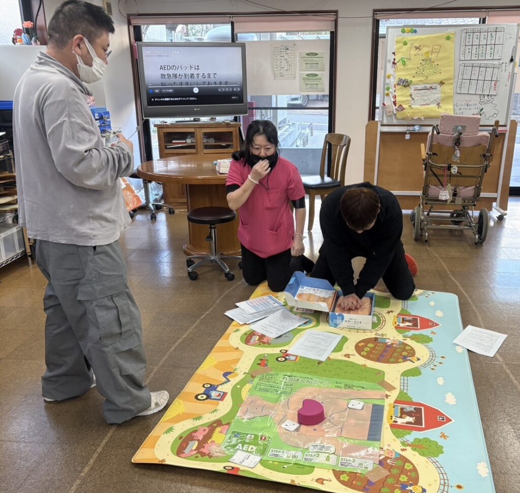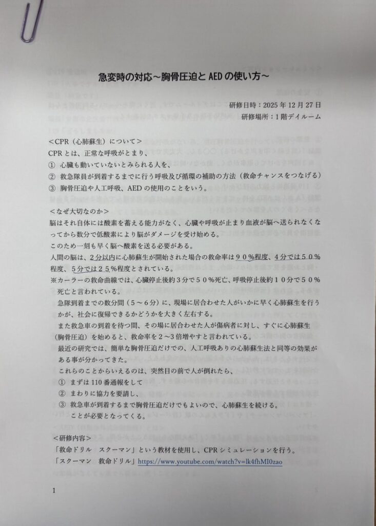 昨年、職員に対して「虐待防止・身体拘束」「AEDの使用方法」「感染予防」についての研修を行いました。